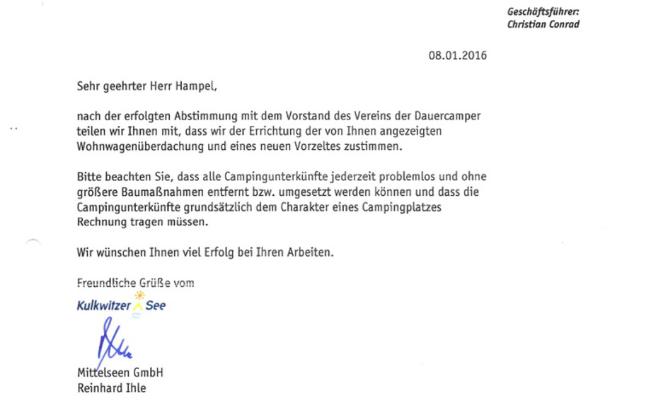 September 2015 - Nachfrage bei Jörg Förster bez. eines festen Vorzeltes und einer Wohnwagenüberdachung. Die Antwort: "Am besten, du reichst es beim Betreiber des Campingplatzes ein, die beteiligen uns dann sowieso."